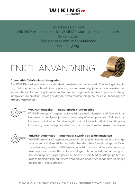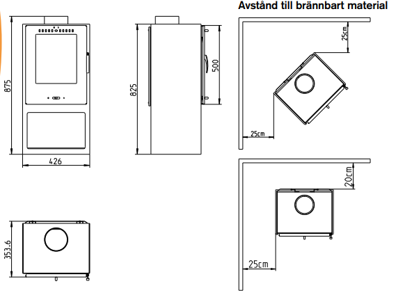 Minsta avstånd från brandfarliga material så som möbler, tapeter, trä: Bak 50 mm Sida samt Front 800 mm