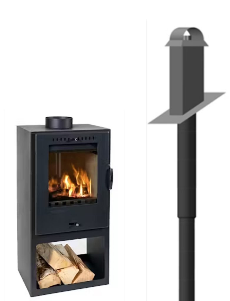 Erbjudande: Kamin Fornax, Betong bänk, Kort golvglas/golvplåt, Skorsten (1 plan) inkl. fyrkantig huv ovan tak (pannor), Taksteg. Montage samt Besiktning. (Tillval: exklusivt trähandtag, + 995 sek).
