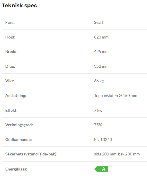 Mått: Bredd glas 268/188 mm, Bredd kamin 369 mm, Djup 428 mm Verkningsgrad 80%, Energiklass A+, Nominell effekt 5,6kW